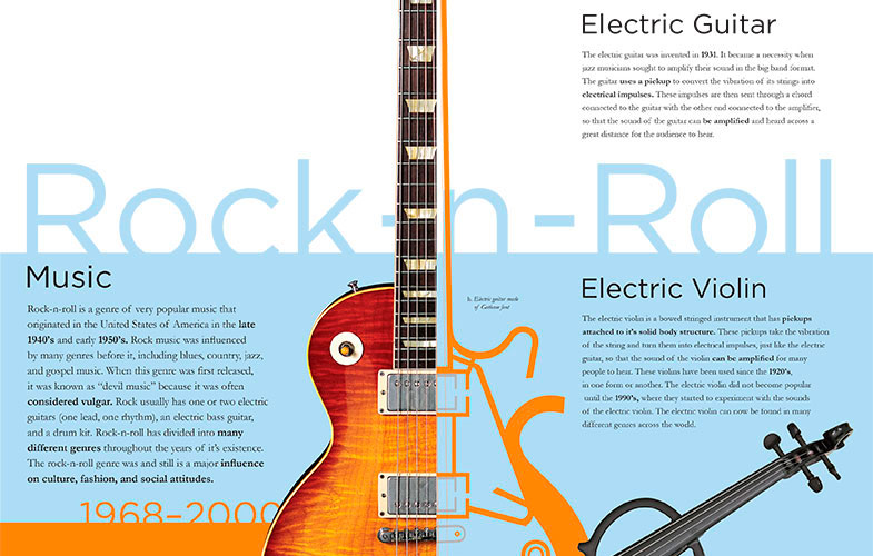 Description: This book was created to inform people about stringed instruments in different eras, as well as, the music from that specific era. The book consists of twelve designed pages. The typeface Garamond was used in all the paragraphs of every page. Different typefaces were assigned to different titles/sub-titles depending on their era. Each page also includes an illustration where one of the instruments are made completely of the font chosen for the era that they are in.